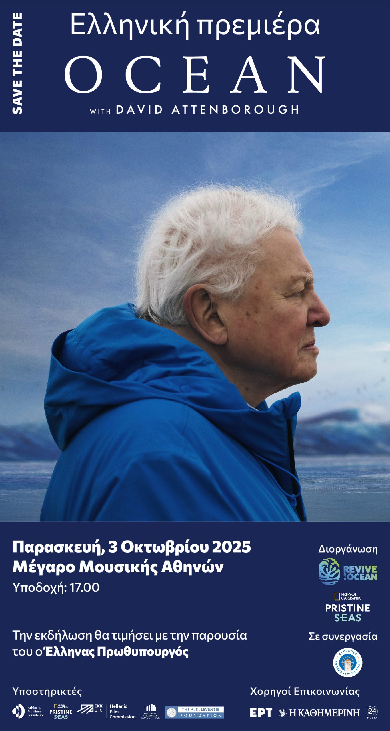 Η ελληνική πρεμιέρα του Ocean with David Attenborough διοργανώνεται από τους Revive Our Ocean και National Geographic Pristine Seas, σε συνεργασία με το Cyclades Preservation Fund (CPF) (το οποίο είναι και μέλος της πρωτοβουλίας ‘’WeSeaYou’’). Την επίσημη έναρξη θα τιμήσει με την παρουσία του ο Έλληνας Πρωθυπουργός.
